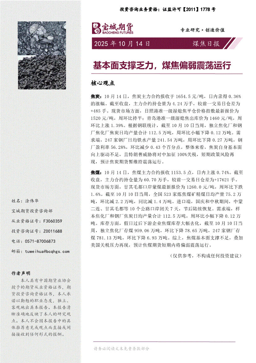 宝城期货-煤焦日报:基本面支撑乏力,煤焦偏弱震荡运行-251014