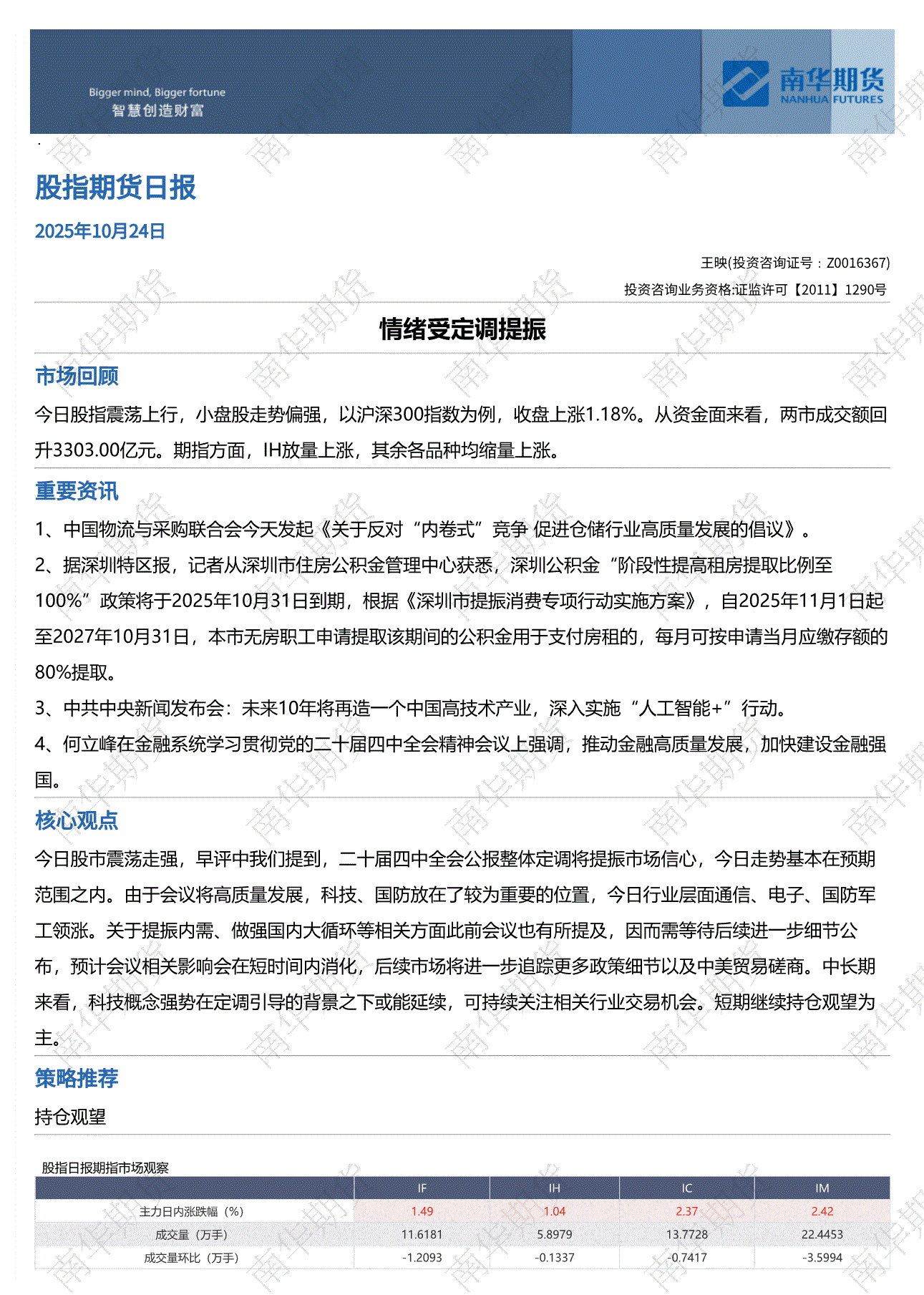 研报:南华期货-股指期货日报:情绪受定调提振-251024