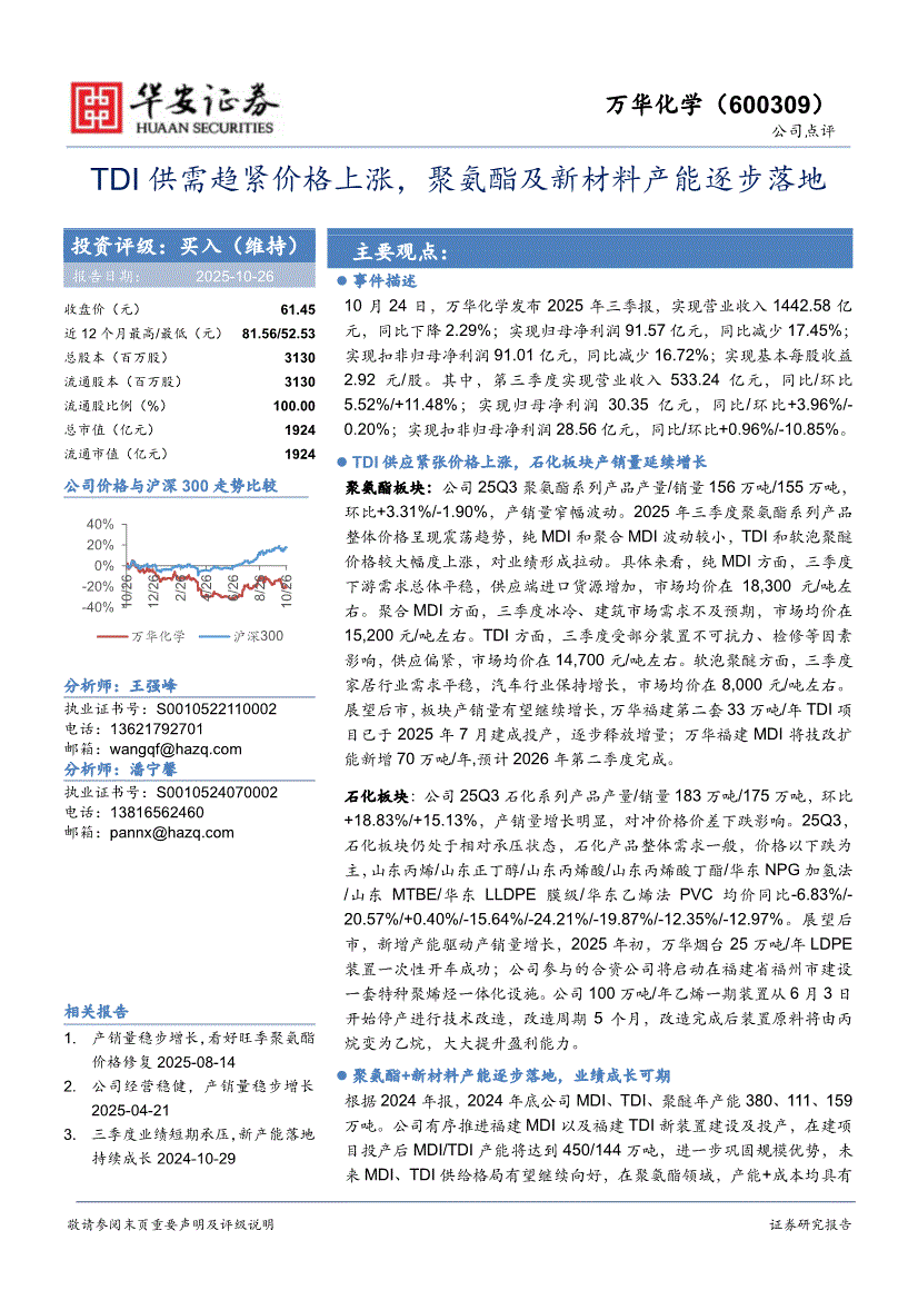 万华化学研报:华安证券-万华化学-600309-TDI供需趋紧价格上涨,聚氨酯及新材料产能逐步落地-251026