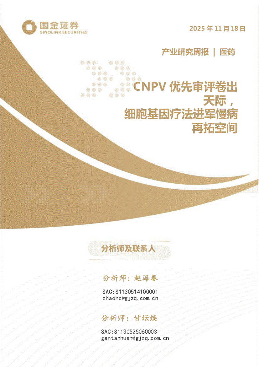 医药行业研报:国金证券-医药行业产业研究周报:CNPV优先审评卷出天际,细胞基因疗法进军慢病再拓空间-251118
