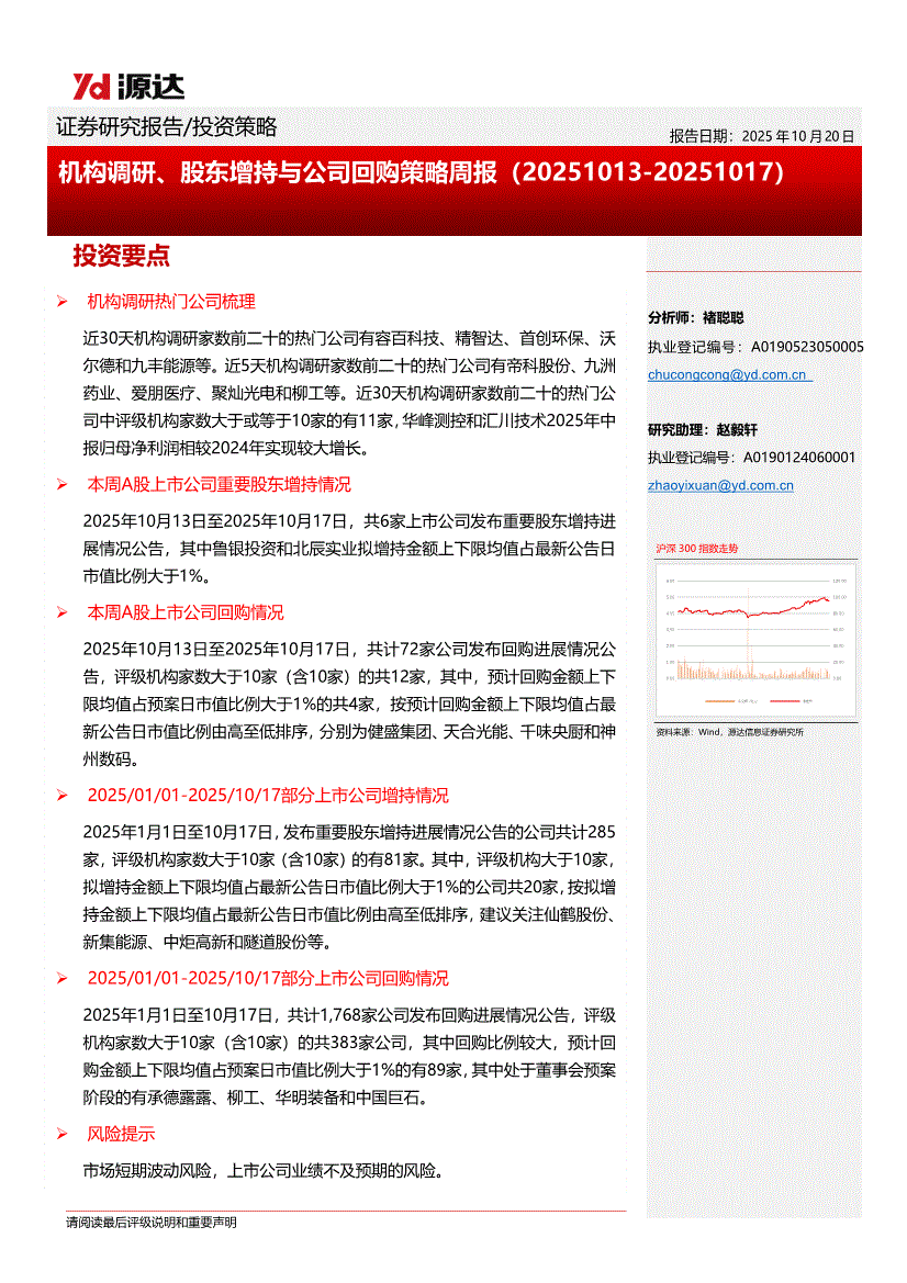 研报:源达信息-机构调研、股东增持与公司回购策略周报-251020
