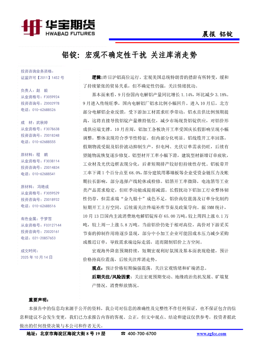 研报:华宝期货-铝锭晨报:宏观不确定性干扰,关注库消走势-251014