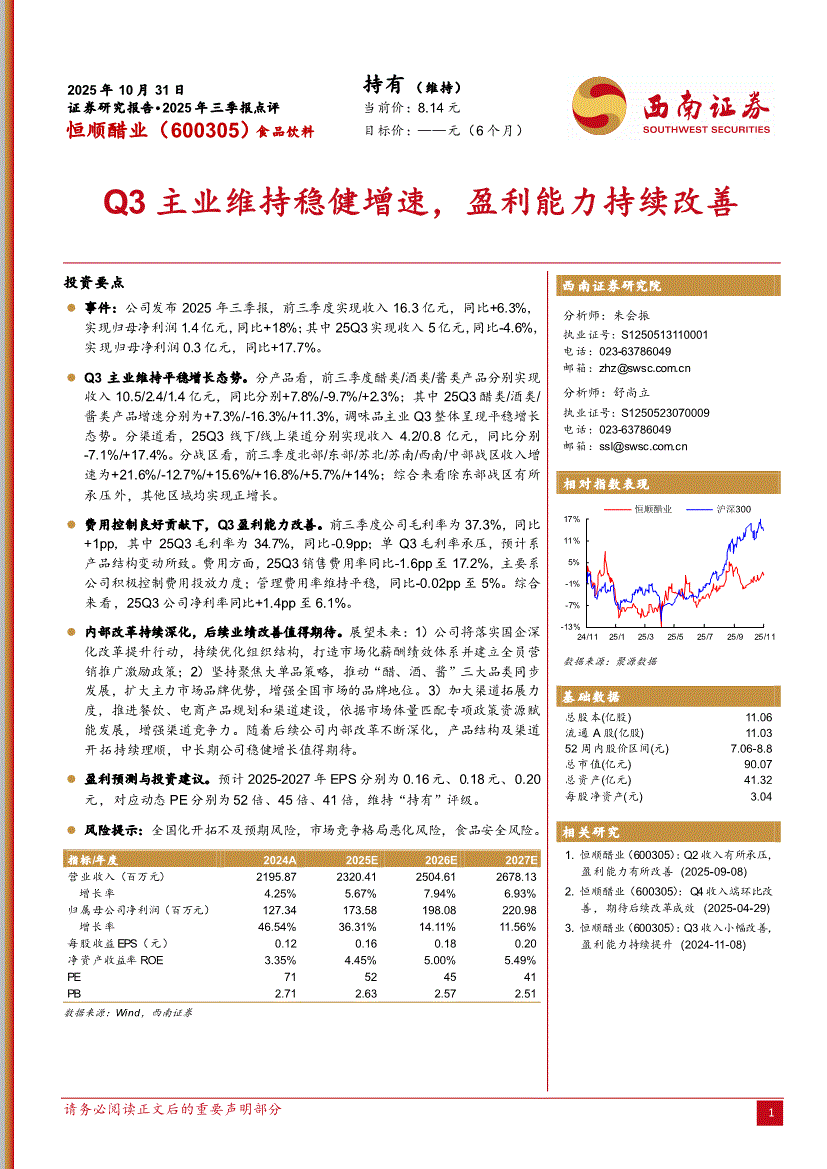 恒顺醋业研报:西南证券-恒顺醋业-600305-Q3主业维持稳健增速,盈利能力持续改善-251031