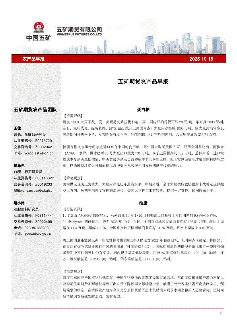 研报:五矿期货-农产品早报-251015