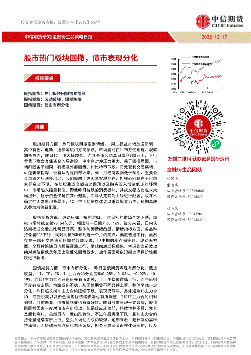 研报:中信期货-金融衍生品策略日报:股市热门板块回撤,债市表现分化-251217