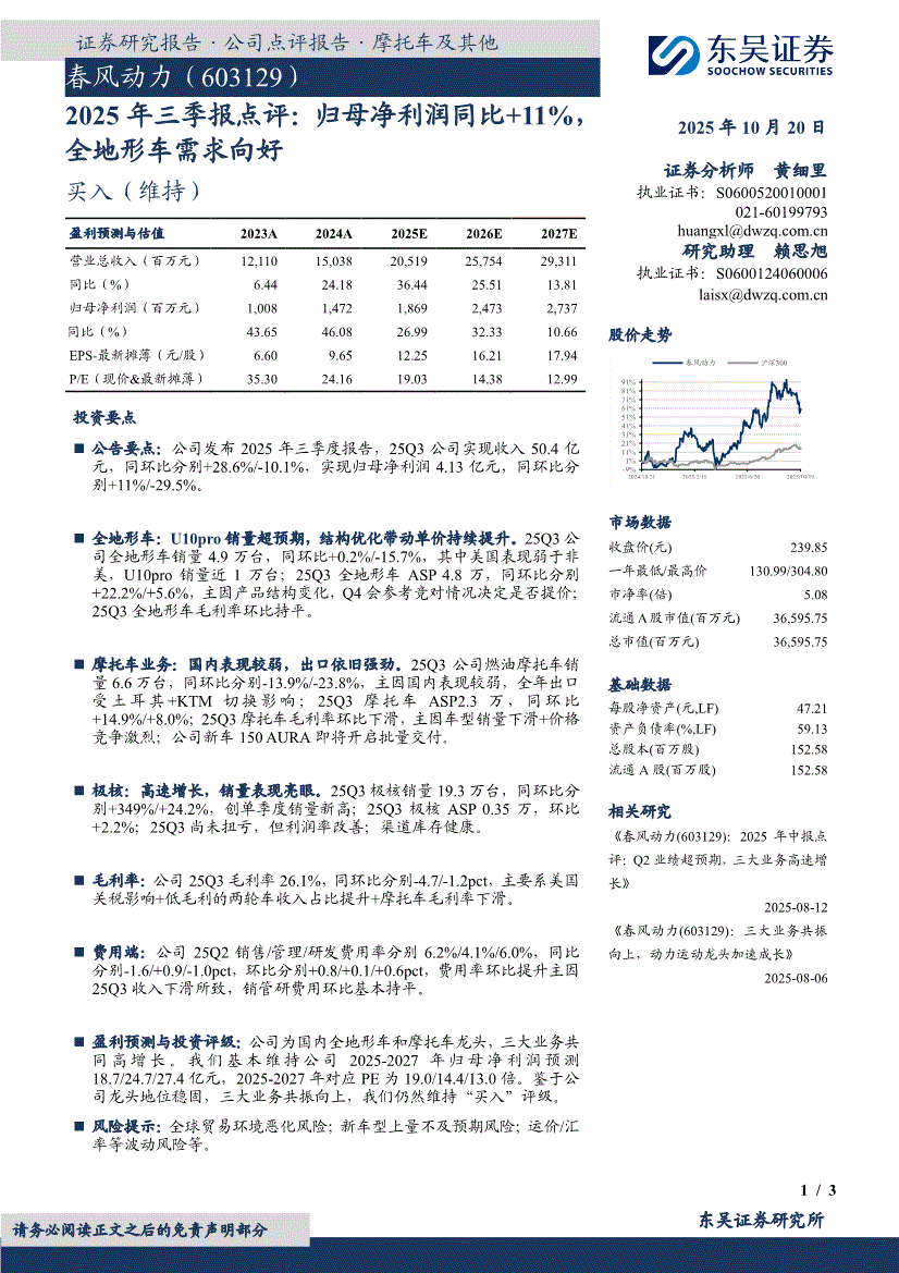春风动力研报:金宝搏官网188金宝搏-春风动力-603129-2025年三季报点评:归母净利润同比+11%,全地形车需求向好-251020