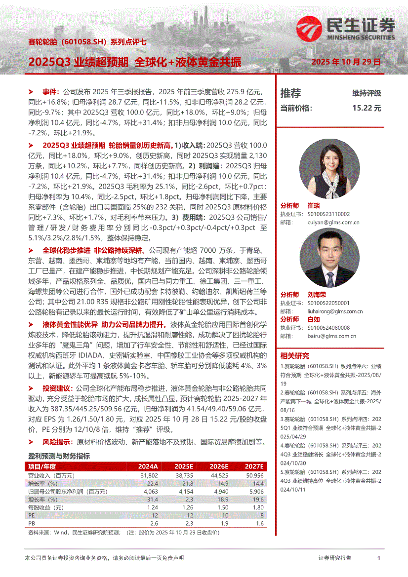 赛轮轮胎研报:民生证券-赛轮轮胎-601058-系列点评七:2025Q3业绩超预期,全球化+液体黄金共振-251029