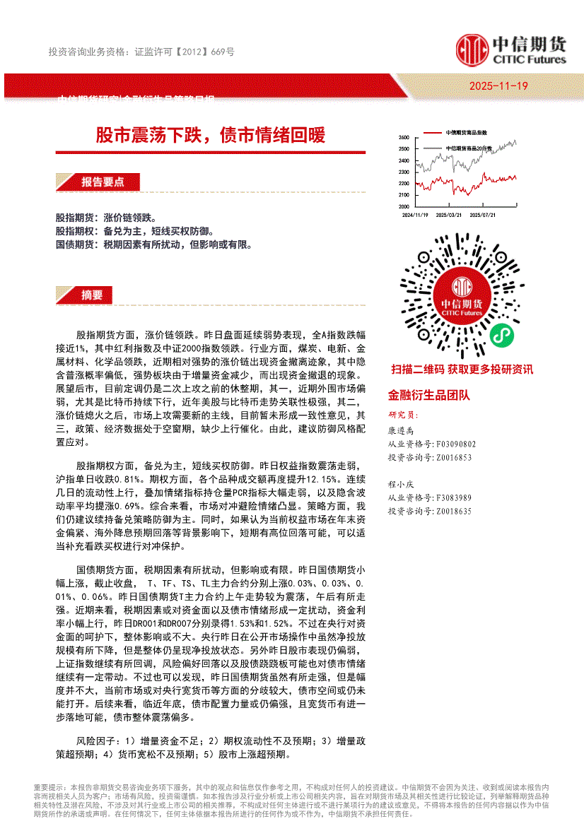 研报:中信期货-金融衍生品策略日报:股市震荡下跌,债市情绪回暖-251119