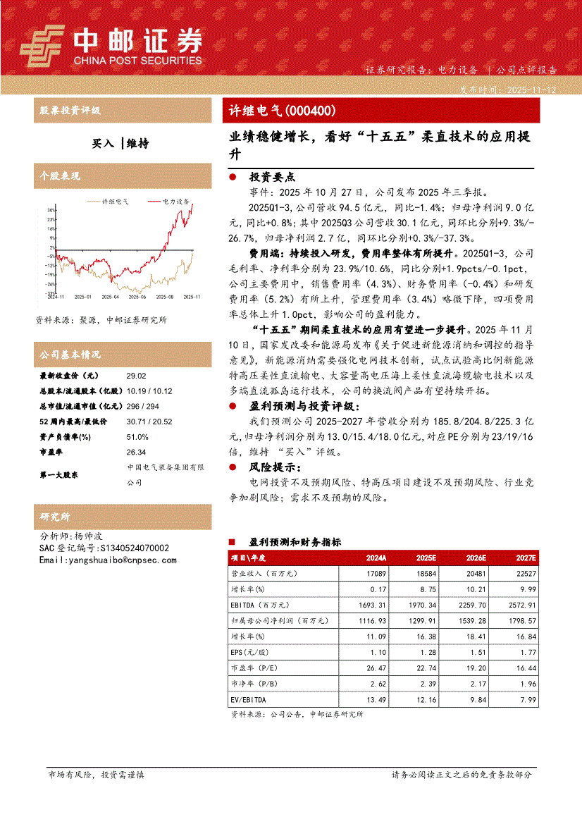 许继电气研报:中邮证券-许继电气-000400-业绩稳健增长,看好“十五五”柔直技术的应用提升-251112