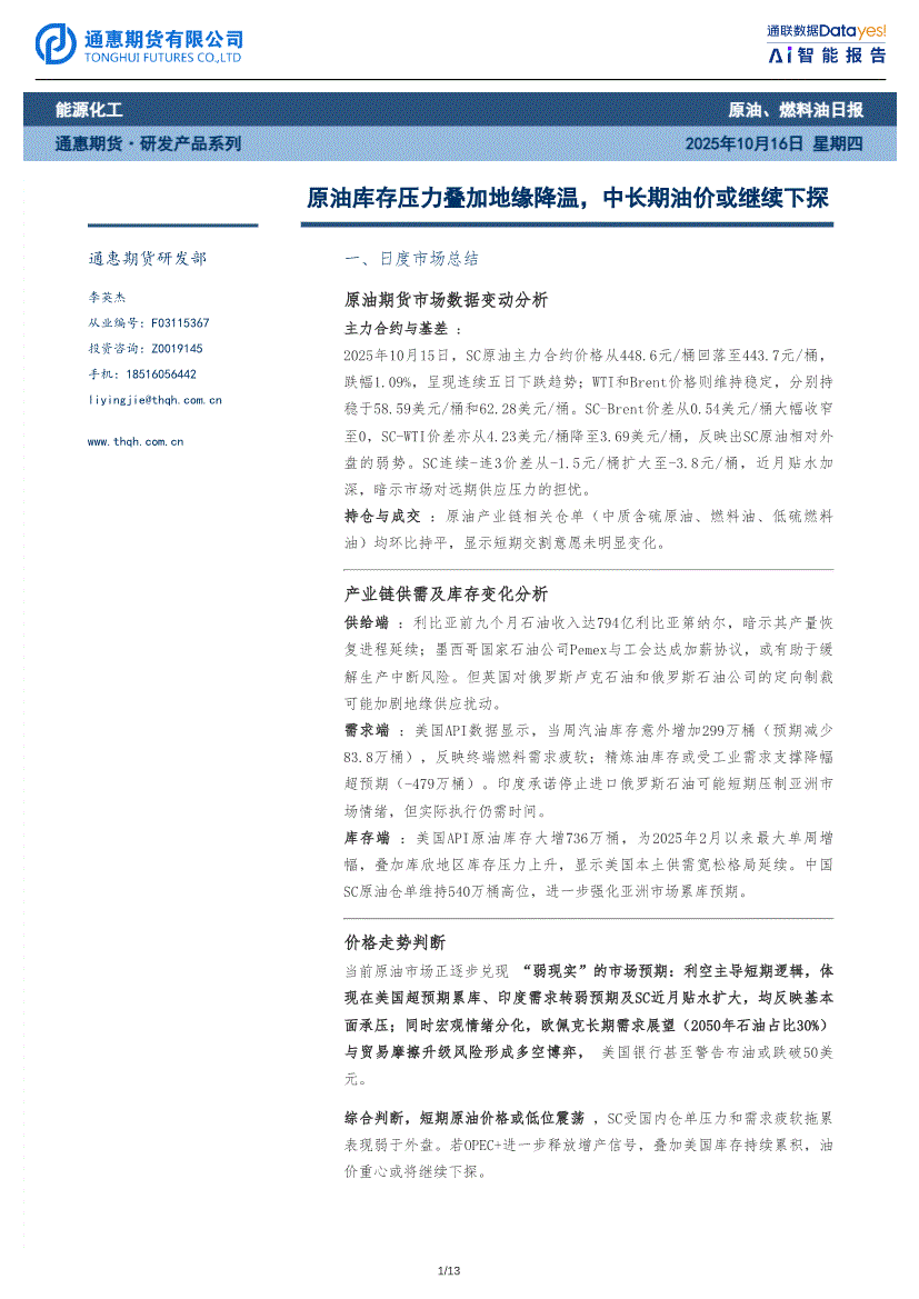研报:通惠期货-原油、燃料油日报:原油库存压力叠加地缘降温,中长期油价或继续下探-251016