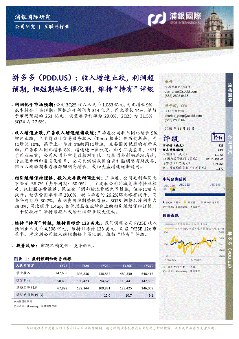 拼多多研报:浦银国际-拼多多-PDD.US-收入增速止跌,利润超预期,但短期缺乏催化剂,维持“持有”评级-251119