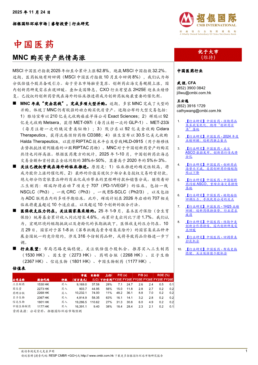 医药行业研报:招银国际-中国医药行业:MNC购买资产热情高涨-251124