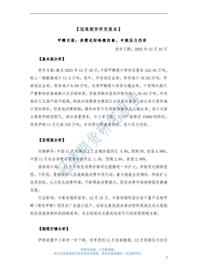 研报:冠通期货-甲醇日报:供需边际略微改善,中期压力仍存-251216