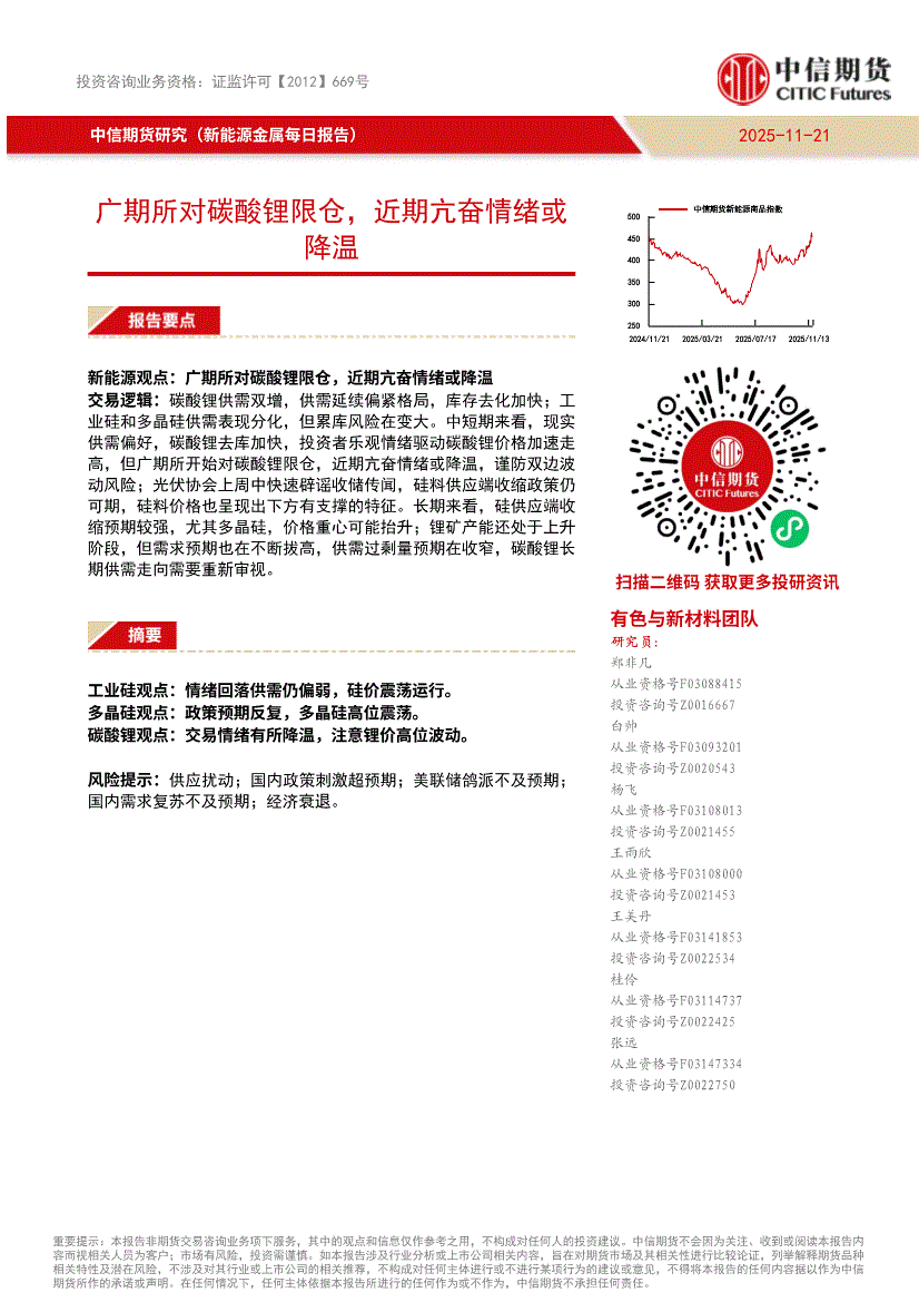 研报:中信期货-新能源金属每日报告:广期所对碳酸锂限仓,近期亢奋情绪或降温-251121