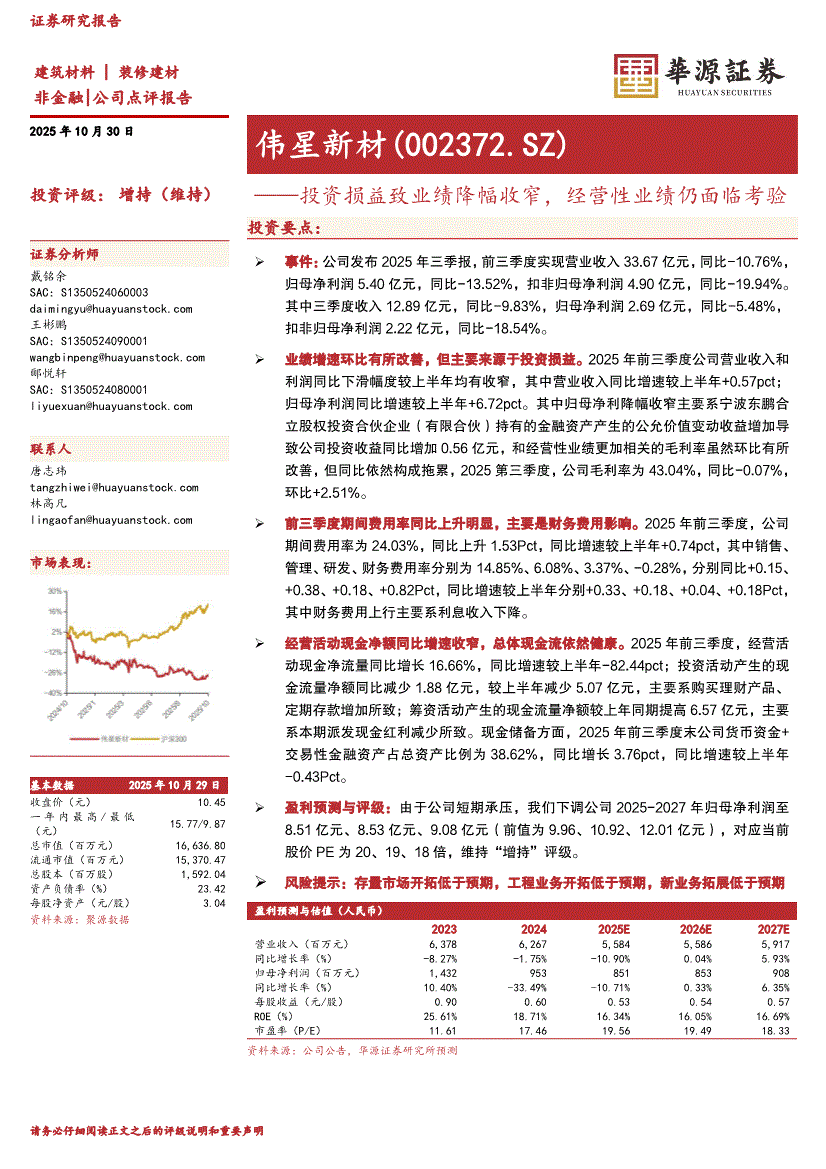 伟星新材研报:华源证券-伟星新材-002372-投资损益致业绩降幅收窄,经营性业绩仍面临考验-251030