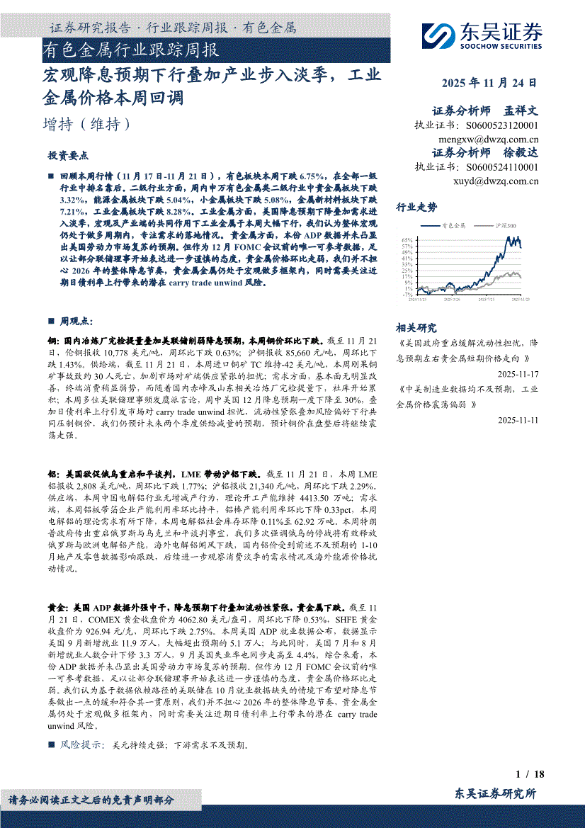 有色金属行业研报:金宝搏官网188金宝搏-有色金属行业跟踪周报:宏观降息预期下行叠加产业步入淡季,工业金属价格本周回调-251124