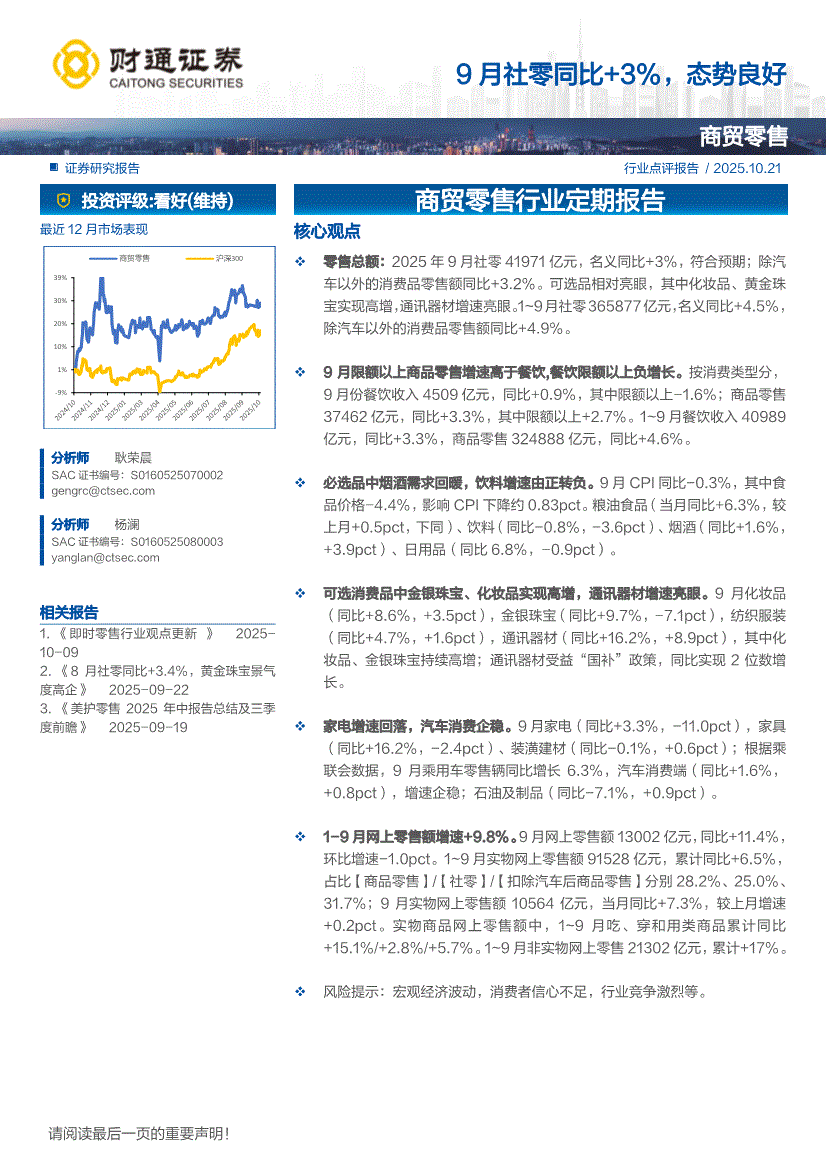 商贸零售行业研报:财通证券-商贸零售行业定期报告:9月社零同比+3%,态势良好-251021
