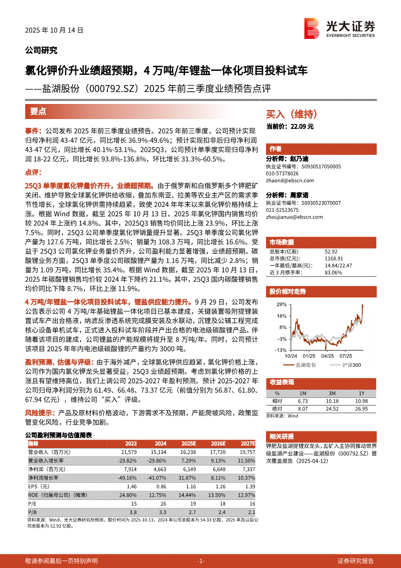 盐湖股份研报:光大证券-盐湖股份-000792-2025年前三季度业绩预告点评:氯化钾价升业绩超预期,4万吨年锂盐一体化项目投料试车-251014