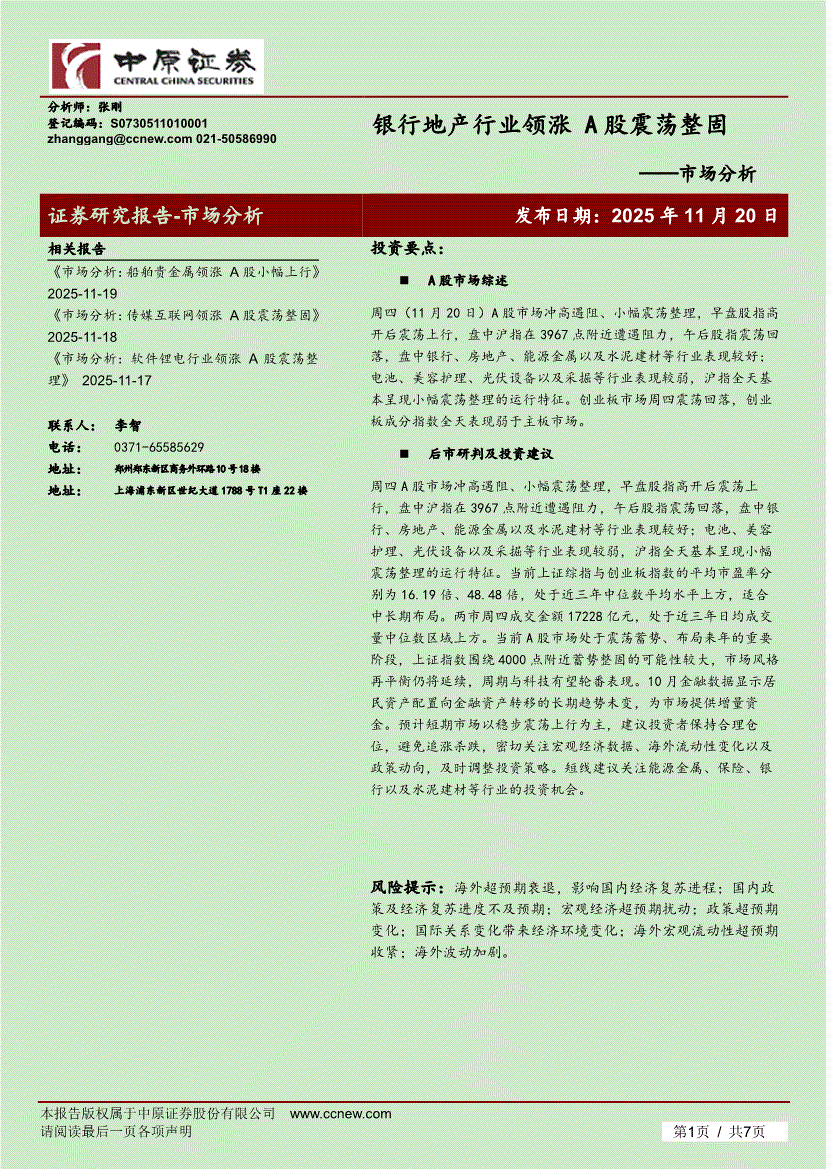 研报:中原证券-市场分析:银行地产行业领涨,A股震荡整固-251120