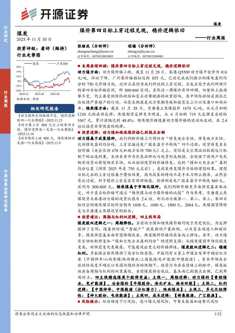 煤炭行业研报:开源证券-煤炭行业周报:煤价第四目标上穿过程兑现,稳价逻辑依旧-251130