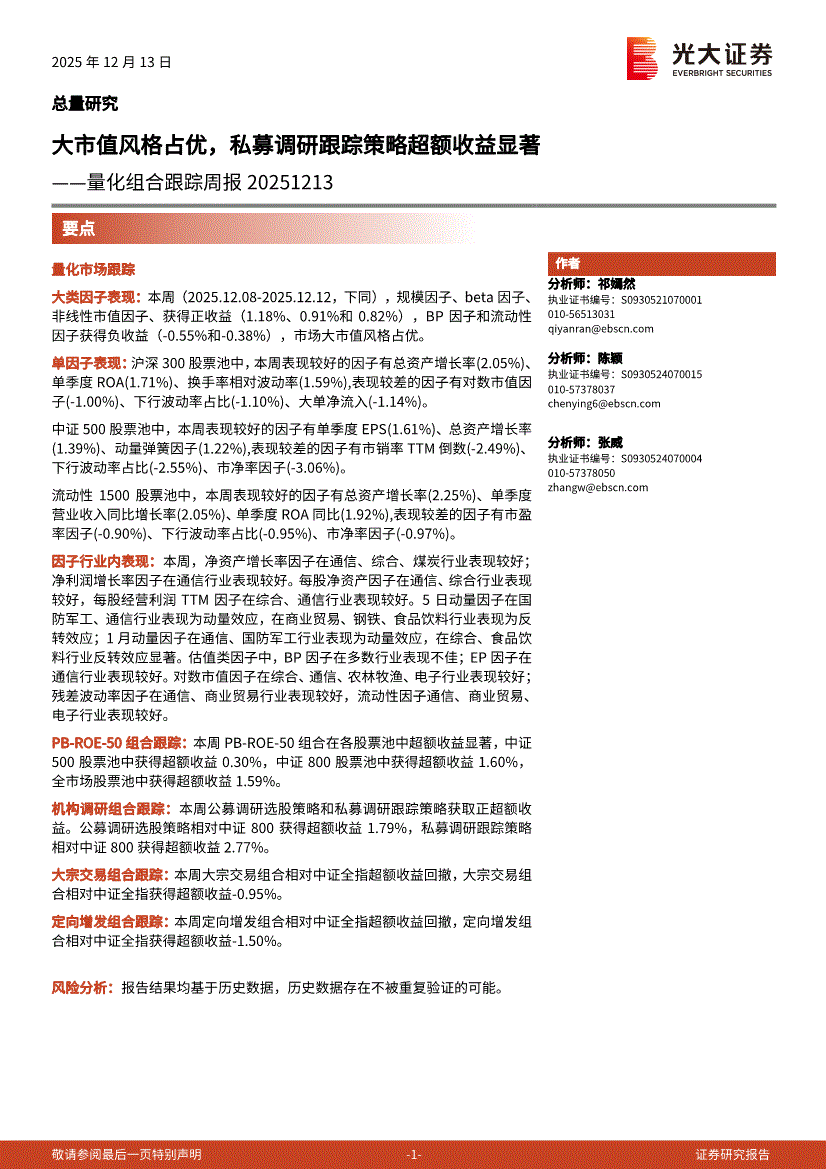 研报:光大证券-量化组合跟踪周报:大市值风格占优,私募调研跟踪策略超额收益显著-251213