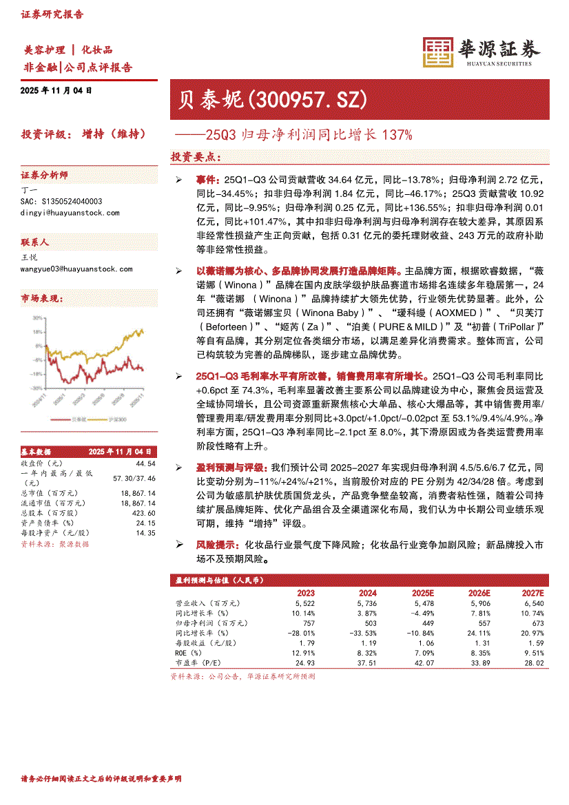 贝泰妮研报:华源证券-贝泰妮-300957-25Q3归母净利润同比增长137%-251104