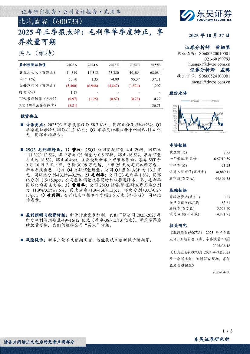 北汽蓝谷研报:金宝搏官网188金宝搏-北汽蓝谷-600733-2025年三季报点评:毛利率单季度转正,享界放量可期-251027