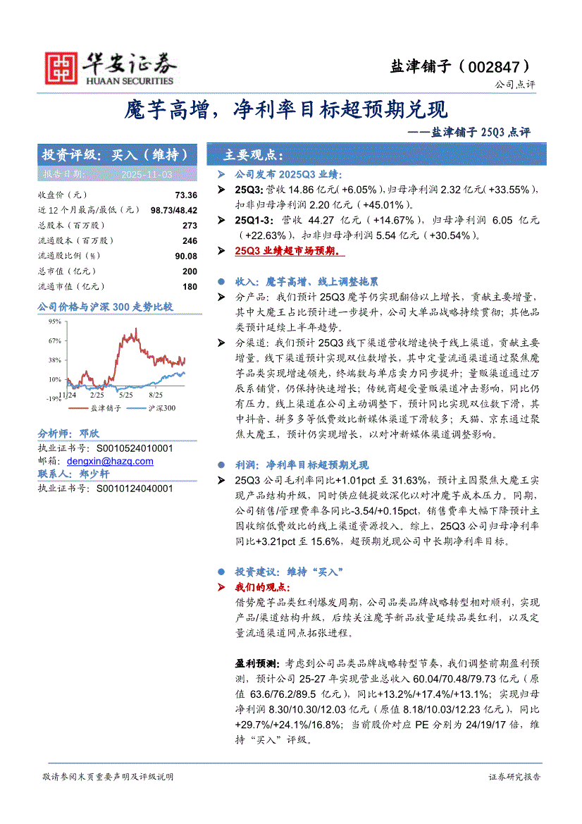 盐津铺子研报:华安证券-盐津铺子-002847-25Q3点评:魔芋高增,净利率目标超预期兑现-251103