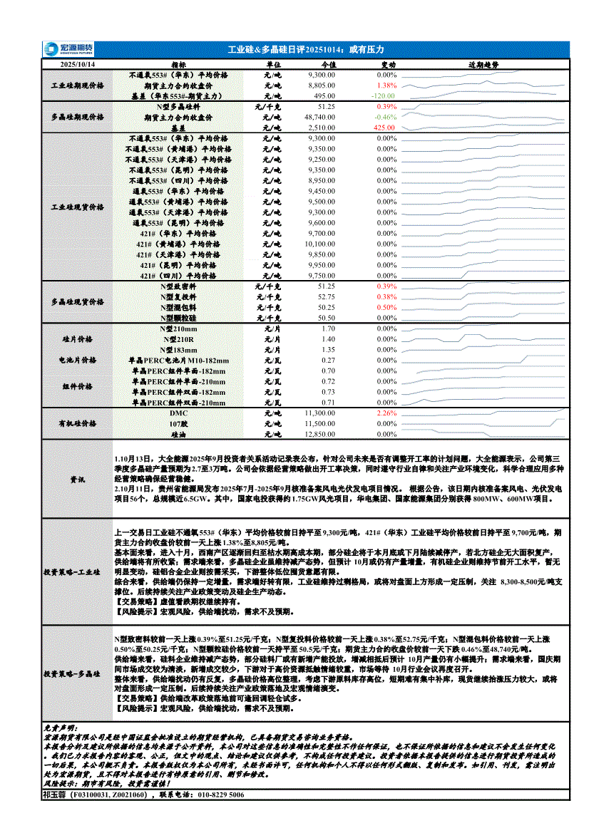 研报:宏源期货-工业硅&多晶硅日评:或有压力-251014