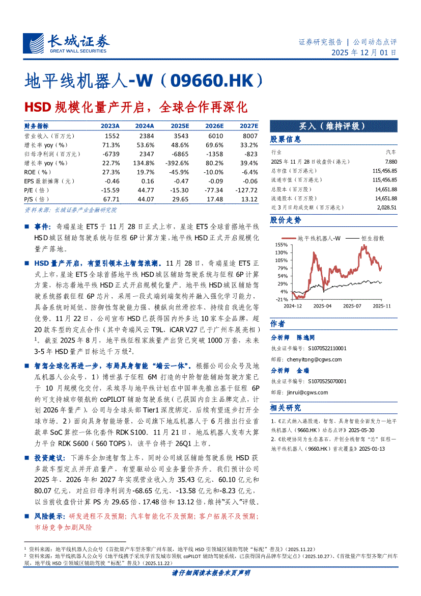 地平线机器人~W研报:长城证券-地平线机器人~W-9660.HK-HSD规模化量产开启,全球合作再深化-251201