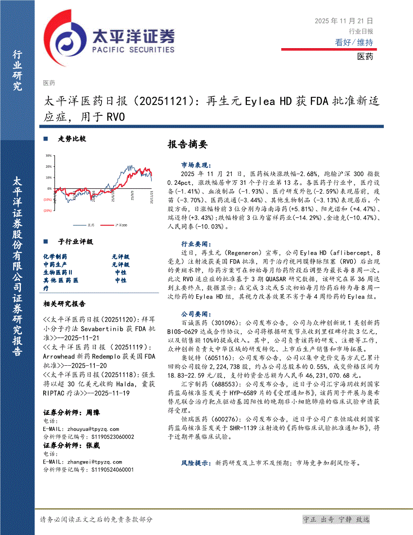 医药行业研报:太平洋证券-医药行业日报:再生元Eylea HD获FDA批准新适应症,用于RVO-251121