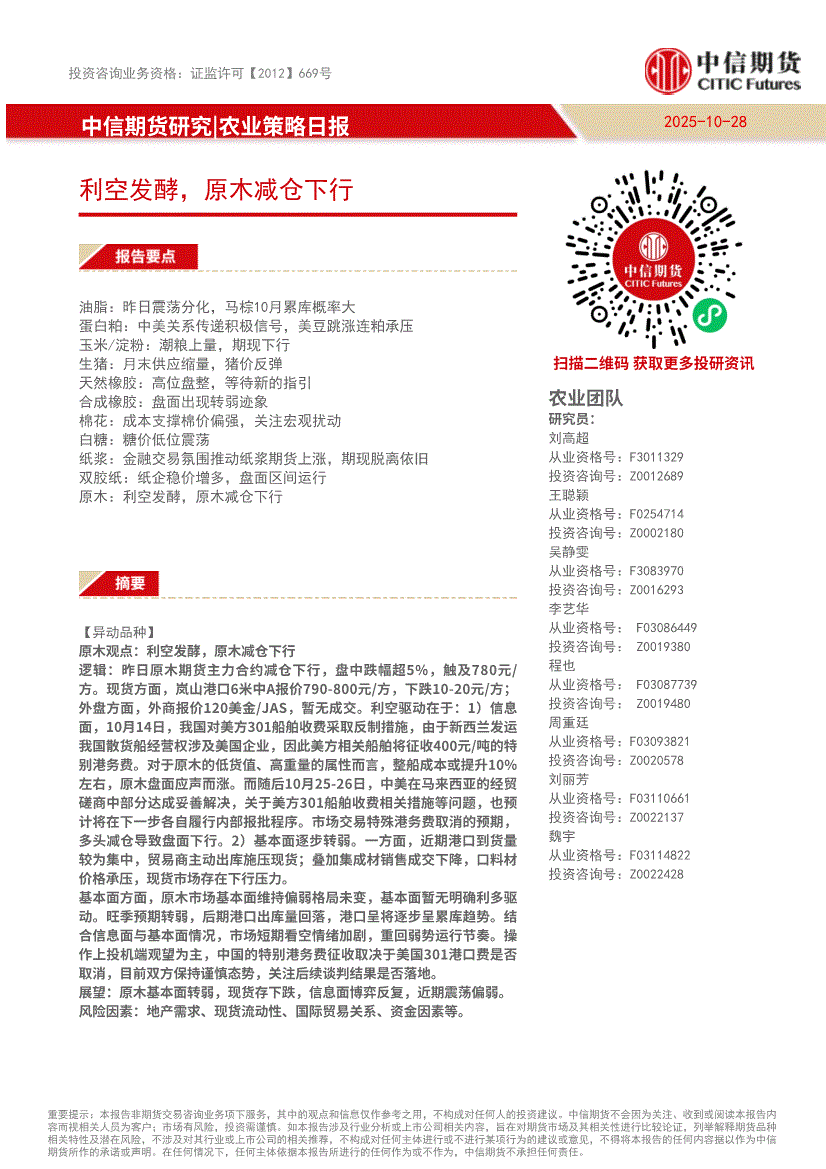 研报:中信期货-农业策略日报:利空发酵,原木减仓下行-251028
