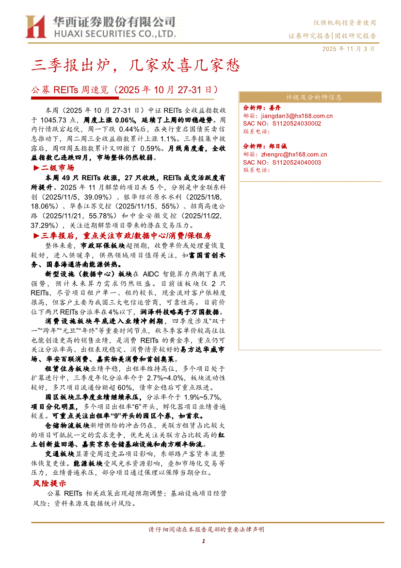 研报:华西证券-公募REITs周速览:三季报出炉,几家欢喜几家愁-251103