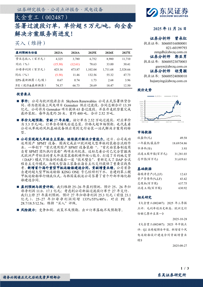 大金重工研报:金宝搏官网188金宝搏-大金重工-002487-签署过渡段订单,单价超5万元吨,向全套解决方案服务商进发!-251126