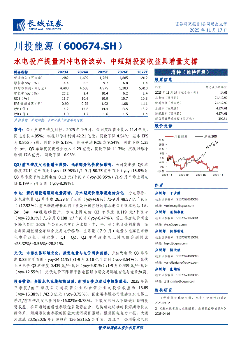 川投能源研报:长城证券-川投能源-600674-水电投产提量对冲电价波动,中短期投资收益具增量支撑-251117