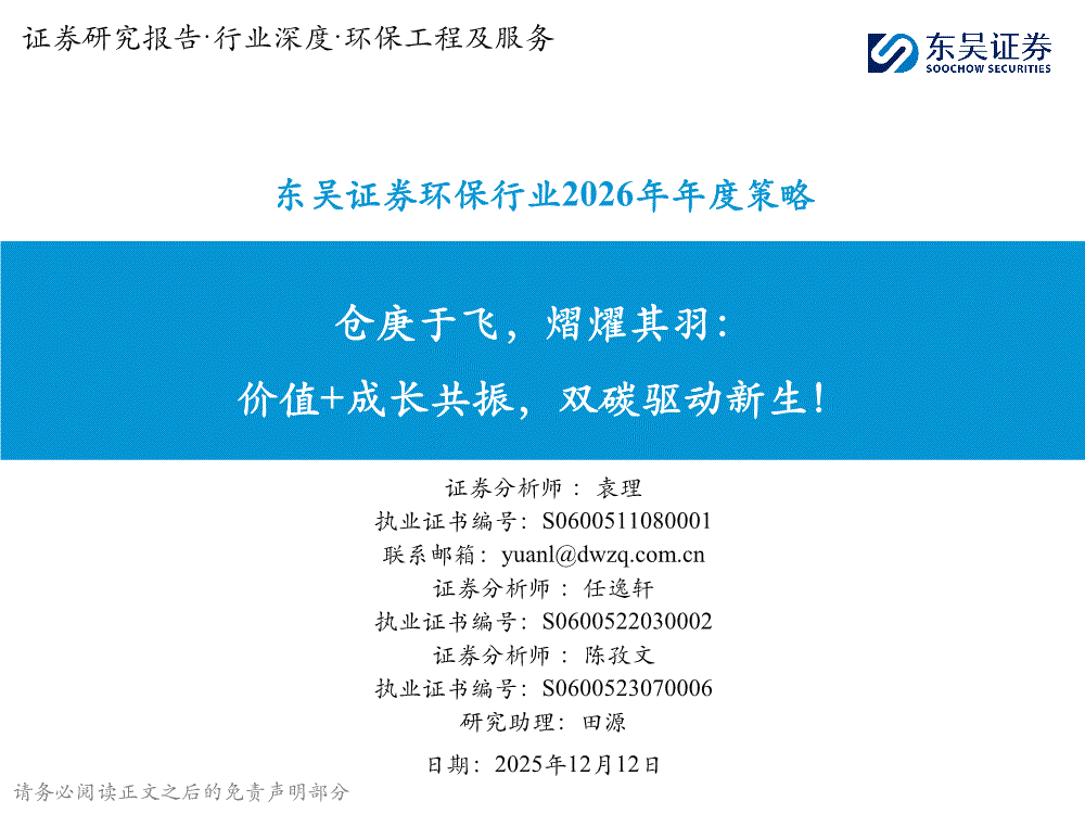 环保行业研报:金宝搏官网188金宝搏-环保行业2026年年度策略:仓庚于飞,熠燿其羽,价值+成长共振,双碳驱动新生!-251212