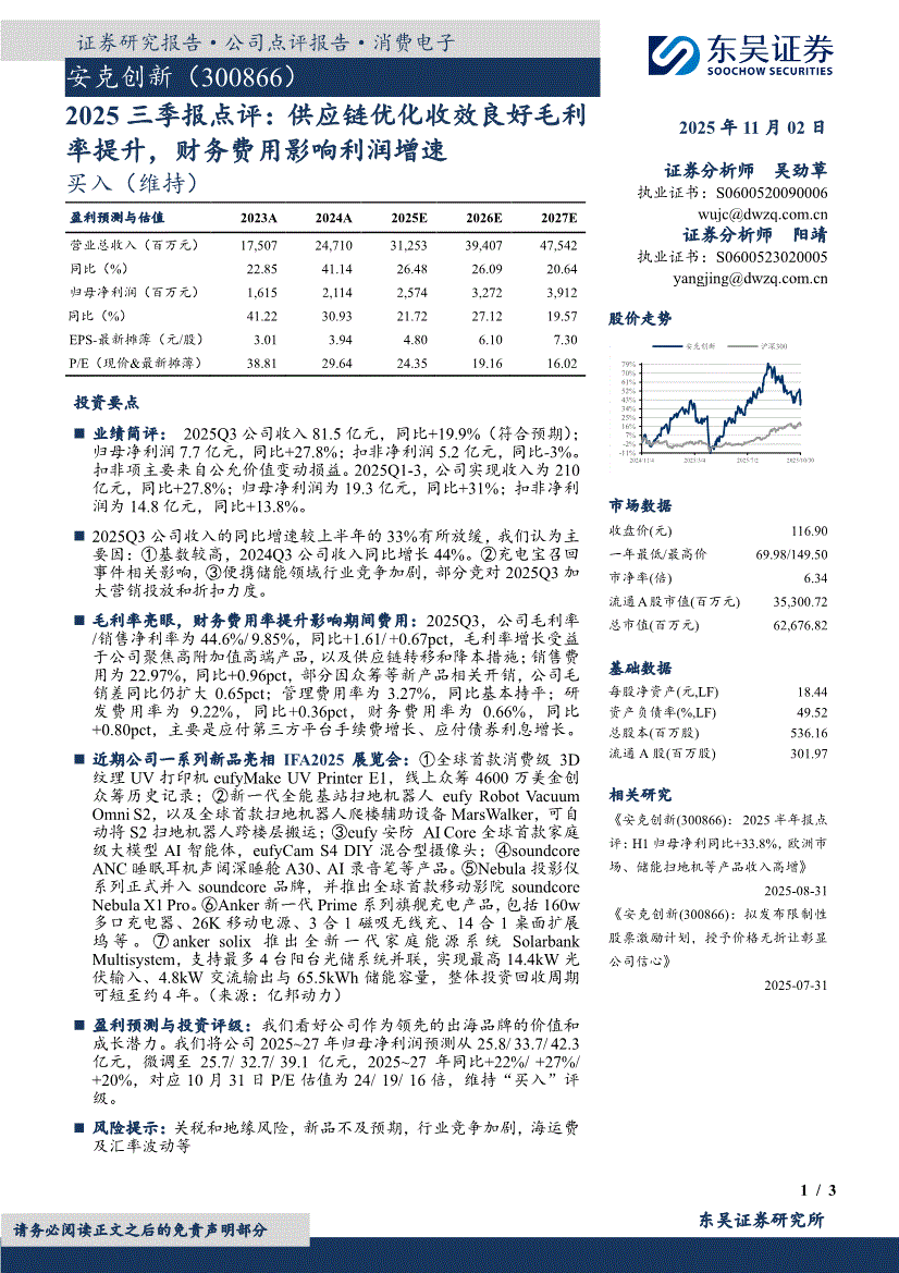 金宝搏官网188金宝搏-安克创新-300866-2025三季报点评:供应链优化收效良好毛利率提升,财务费用影响利润增速-251102