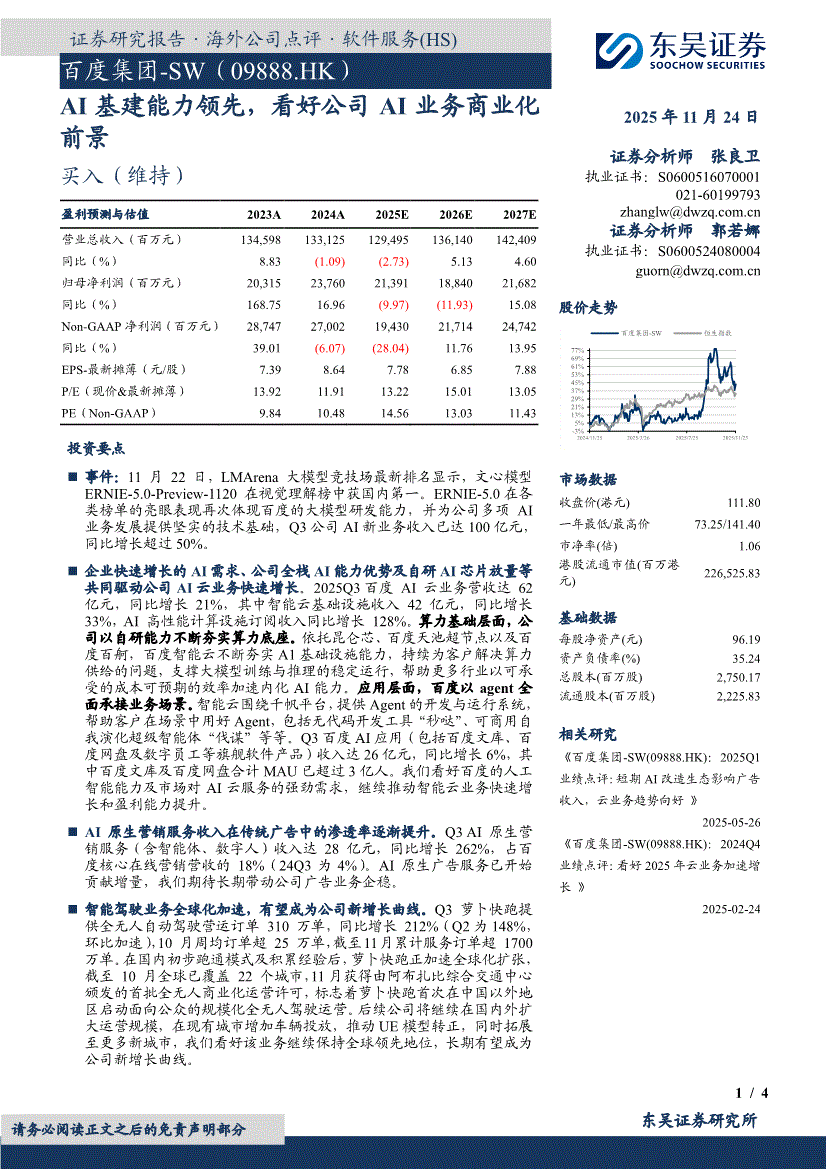 百度集团~SW研报:金宝搏官网188金宝搏-百度集团~SW-9888.HK-AI基建能力领先,看好公司AI业务商业化前景-251124