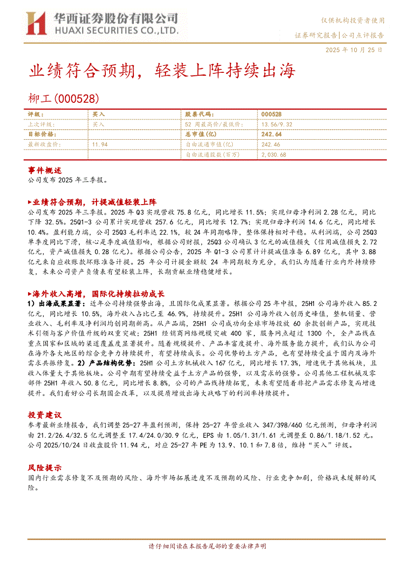 柳工研报:华西证券-柳工-000528-业绩符合预期,轻装上阵持续出海-251025