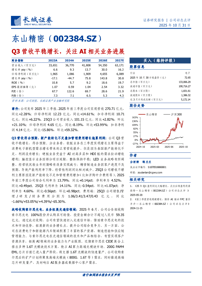 东山精密研报:长城证券-东山精密-002384-Q3营收平稳增长,关注AI相关业务进展-251031