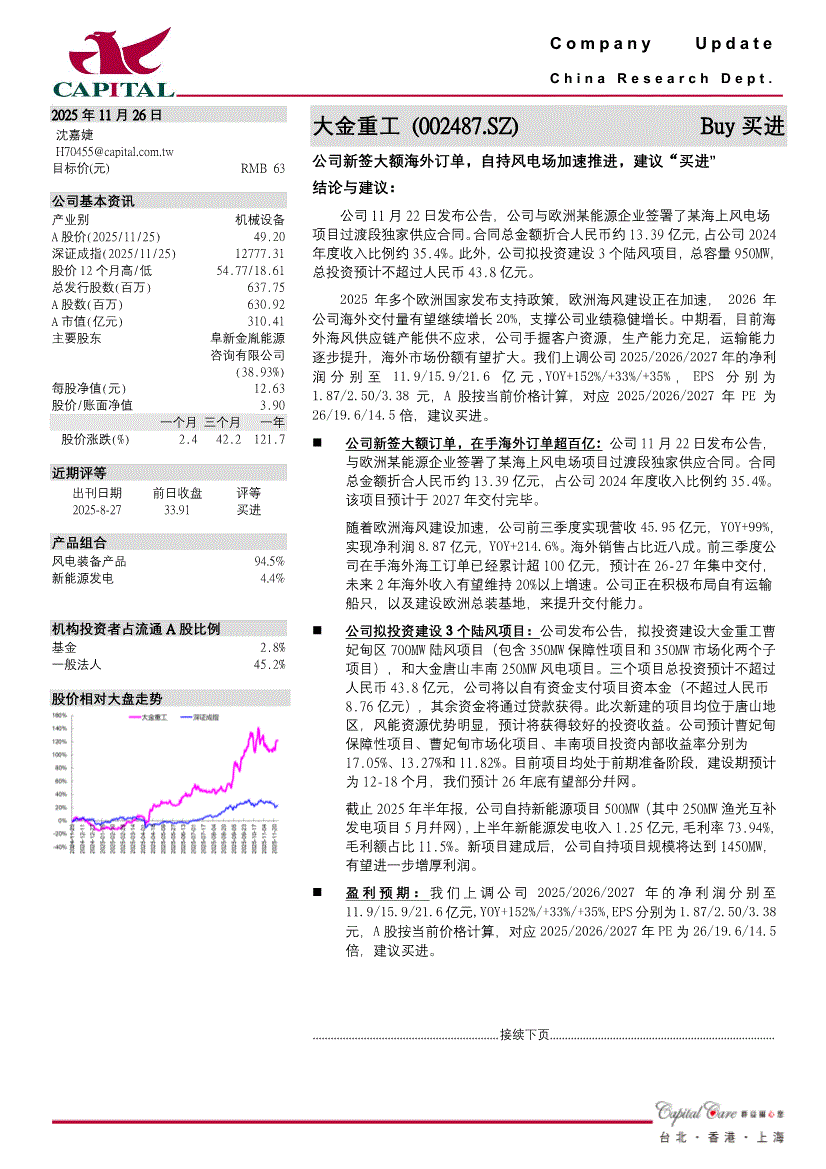 大金重工研报:群益证券-大金重工-002487-公司新签大额海外订单,自持风电场加速推进,建议“买进”-251126