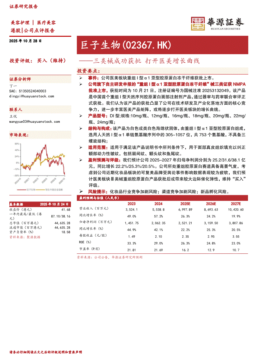 巨子生物研报:华源证券-巨子生物-2367.HK-三类械成功获批,打开医美增长曲线-251028