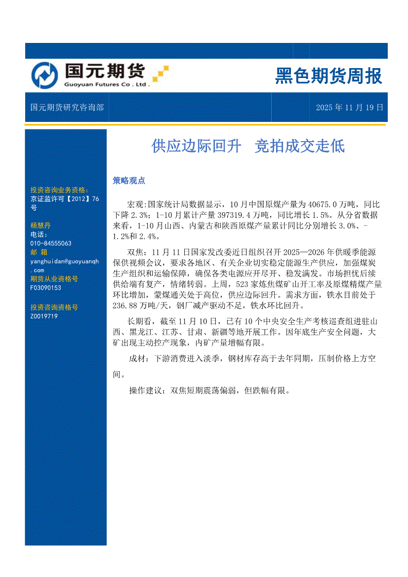 国元期货-黑色期货周报:供应边际回升,竞拍成交走低-251119