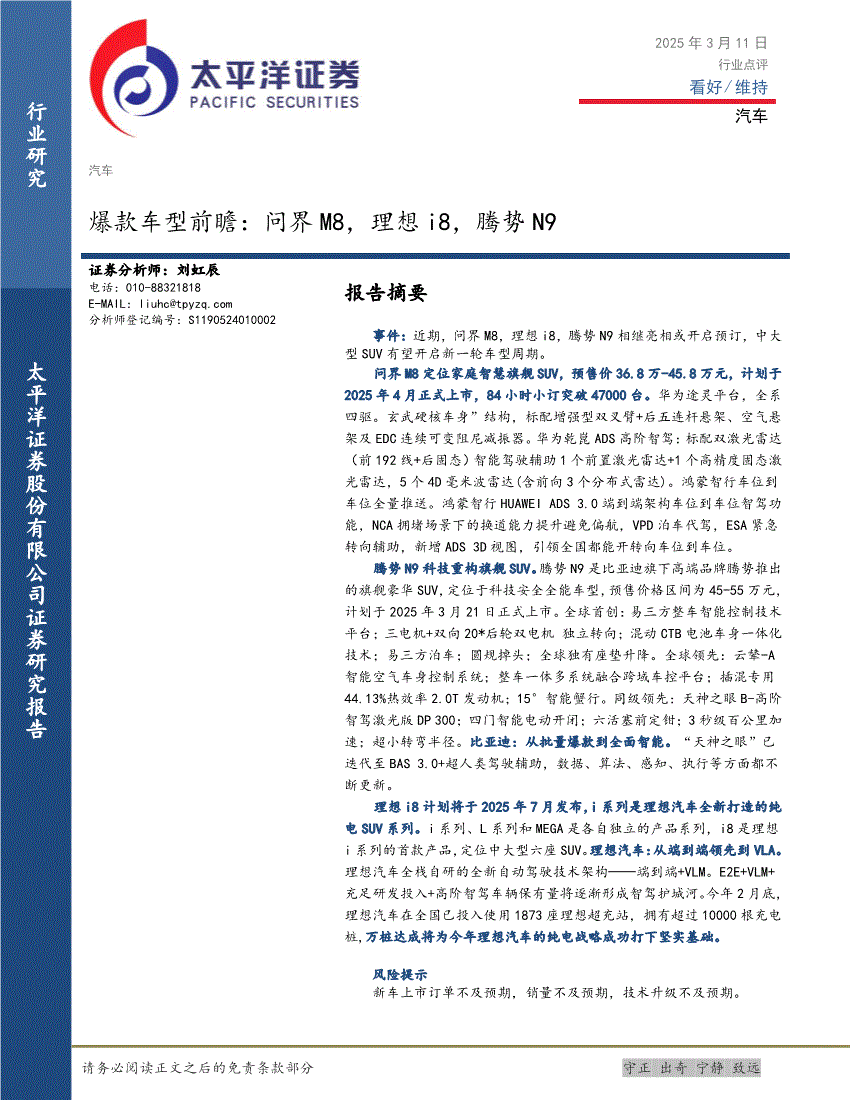 汽车行业研报:太平洋证券-汽车行业爆款车型前瞻:问界M8,理想i8,腾势N9-250311