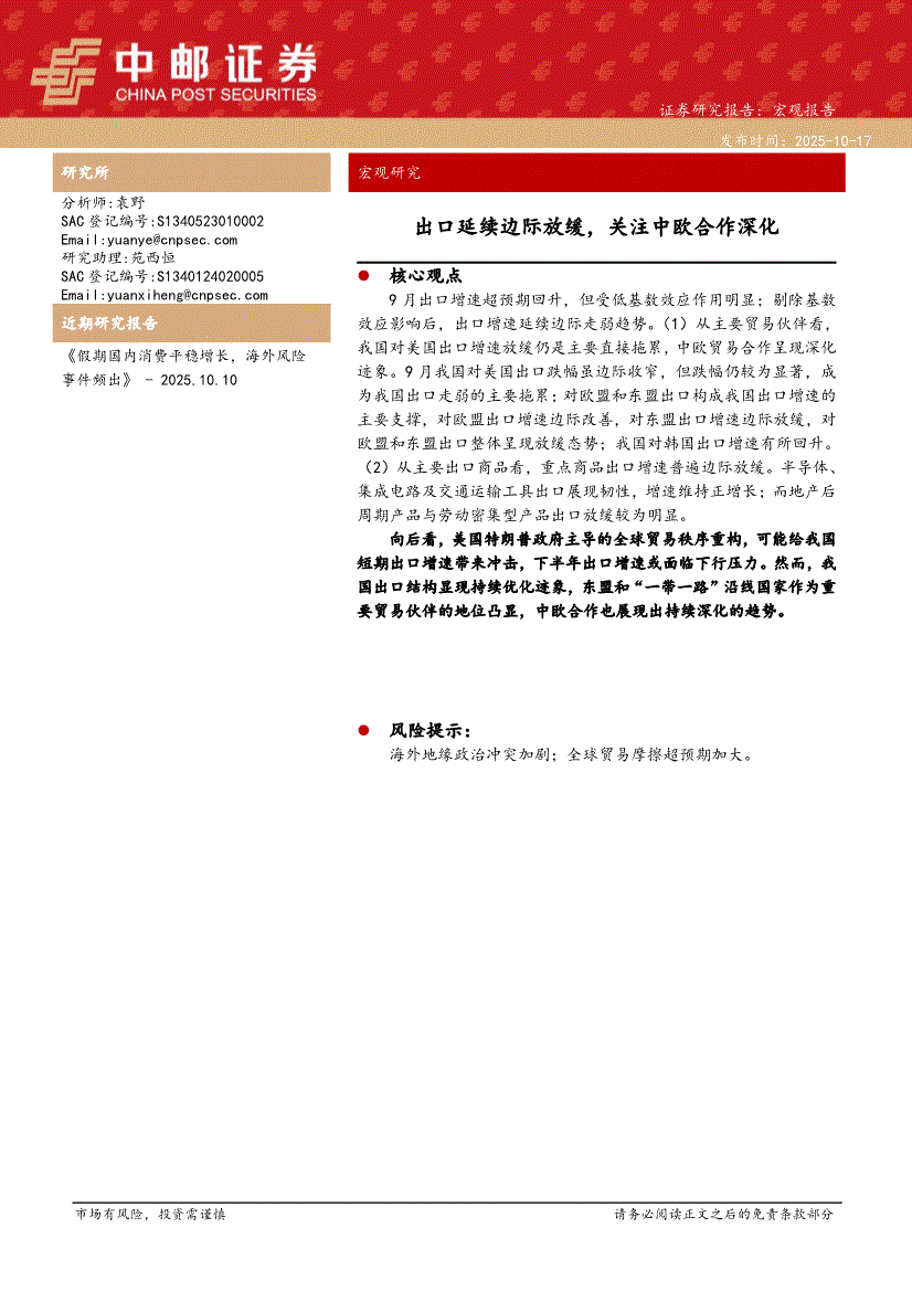 研报:中邮证券-宏观研究:出口延续边际放缓,关注中欧合作深化-251017