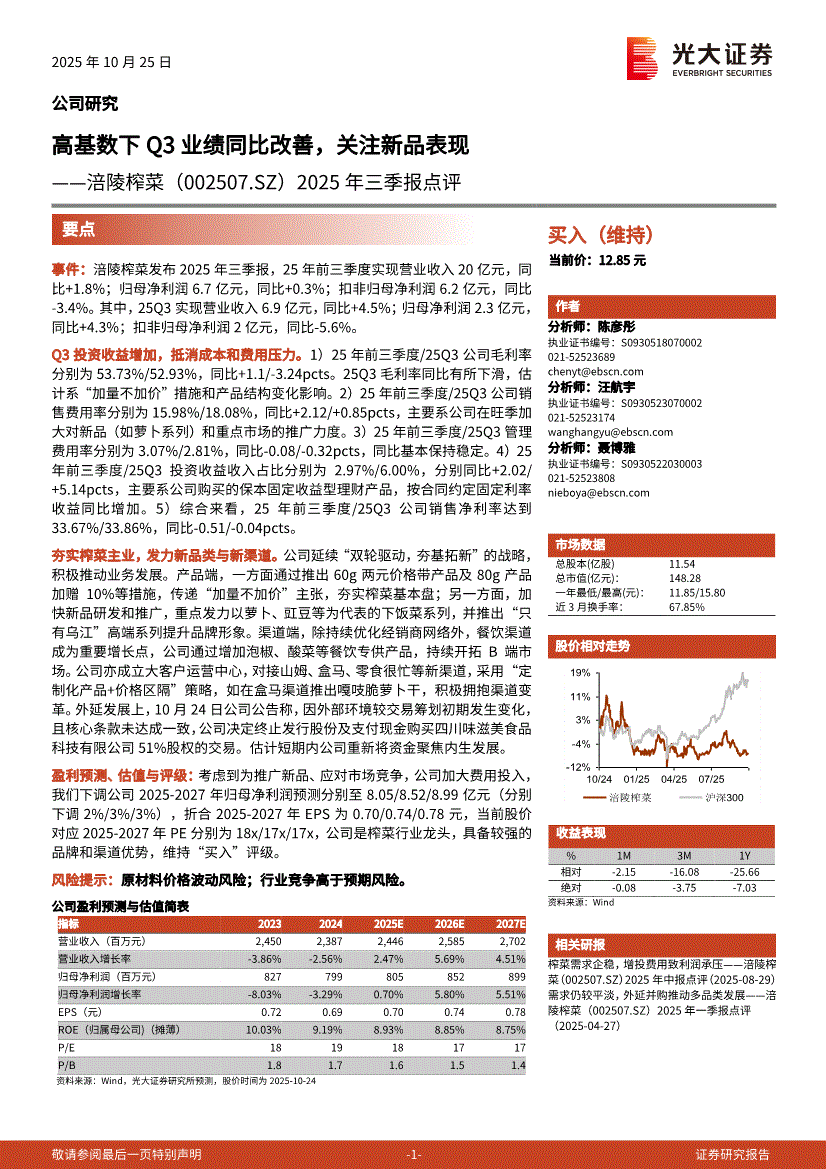 涪陵榨菜研报:光大证券-涪陵榨菜-002507-2025年三季报点评:高基数下Q3业绩同比改善,关注新品表现-251025