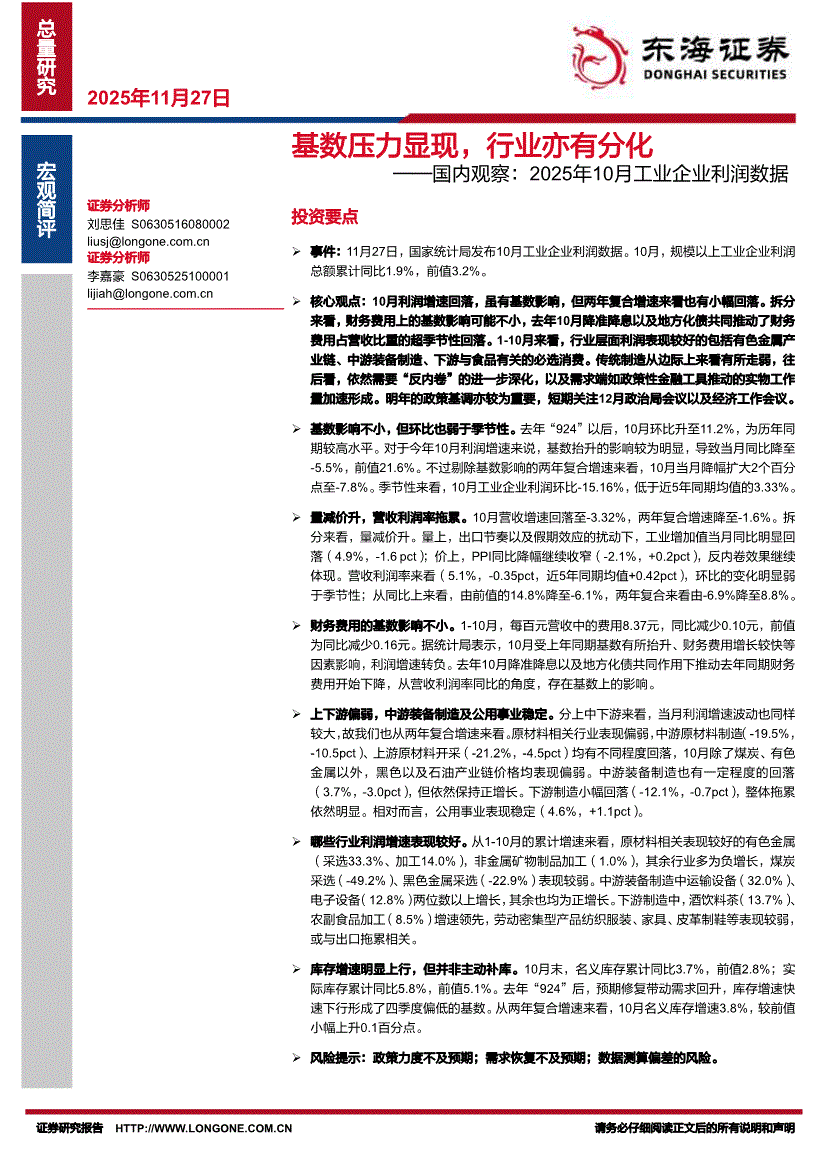 研报:东海证券-国内观察:2025年10月工业企业利润数据,基数压力显现,行业亦有分化-251127
