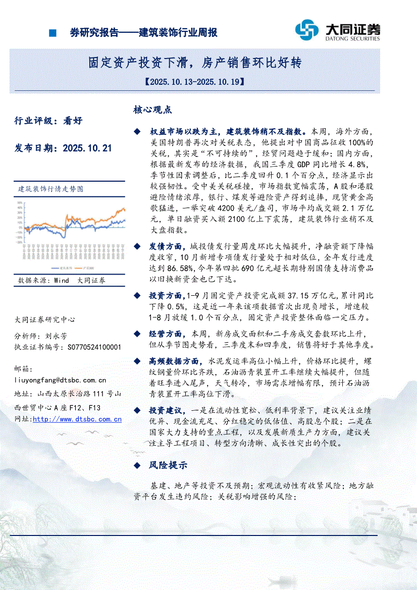 建筑装饰行业研报:大同证券-建筑装饰行业周报:固定资产投资下滑,房产销售环比好转-251021