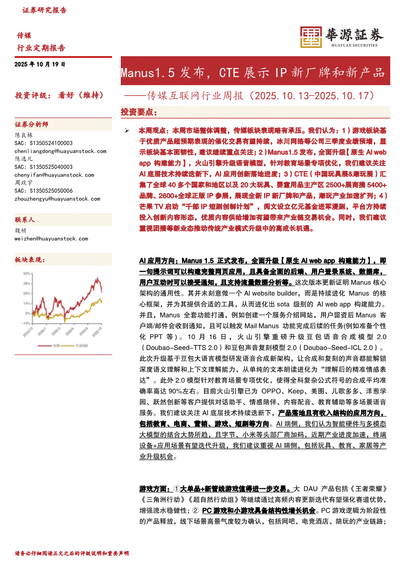 传媒互联网行业研报:华源证券-传媒互联网行业周报:Manus1.5发布,CTE展示IP新厂牌和新产品-251019