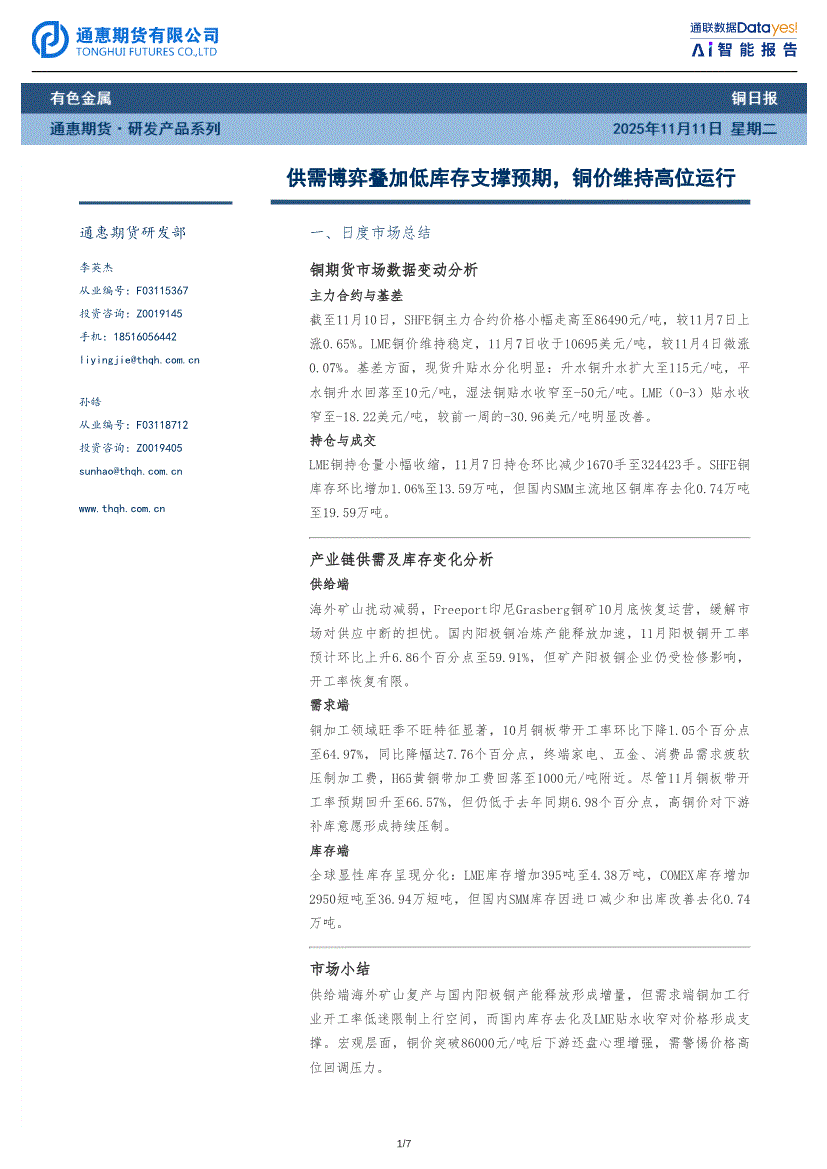 研报:通惠期货-铜日报:供需博弈叠加低库存支撑预期,铜价维持高位运行-251111